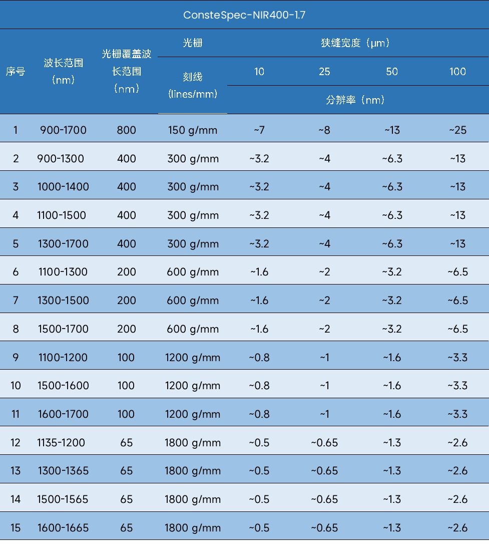ConsteSpec-NIR400:专注近红外(900-1700nm),光学分辨率高(0.5-14nm),波长精度≤0.5nm,杂散光<0.1%,采用高性能InGaAs探测器,适用于成分分析、材料检测。
