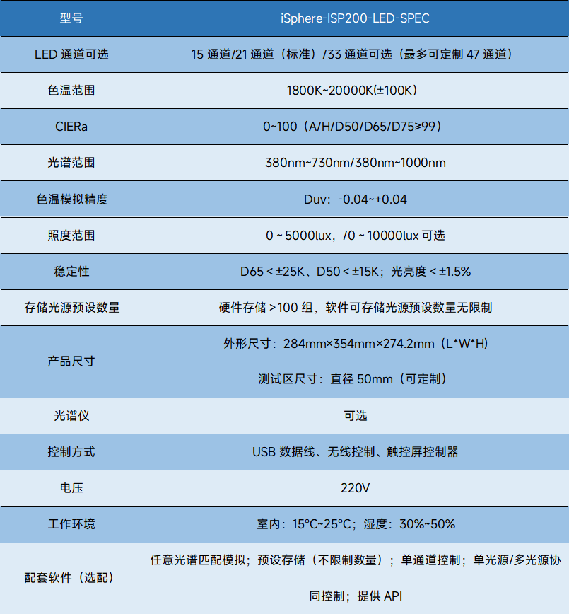 iSphere-ISP200-LED-SPEC的高均匀光谱可调光源,可实现从380nm~1000nm范围内的所有光谱模拟,可均匀照射相机和光电传感器,最大支持230度视场相机与传感器的可见光及红外波段的校正,广泛应用于光线传感器在研发、生产过程中的校准与标定使用,高均匀性、高稳定性、光谱覆盖范围、实时光谱模拟、实时光谱照度色温监控、以及支持客制化等特点,广泛应用于手机/平板/笔记本屏幕光线传感器标定、车载屏幕光线传感器标定、智能电视/会议屏/智慧屏等应用的传感器标定,以及摄像头校正。