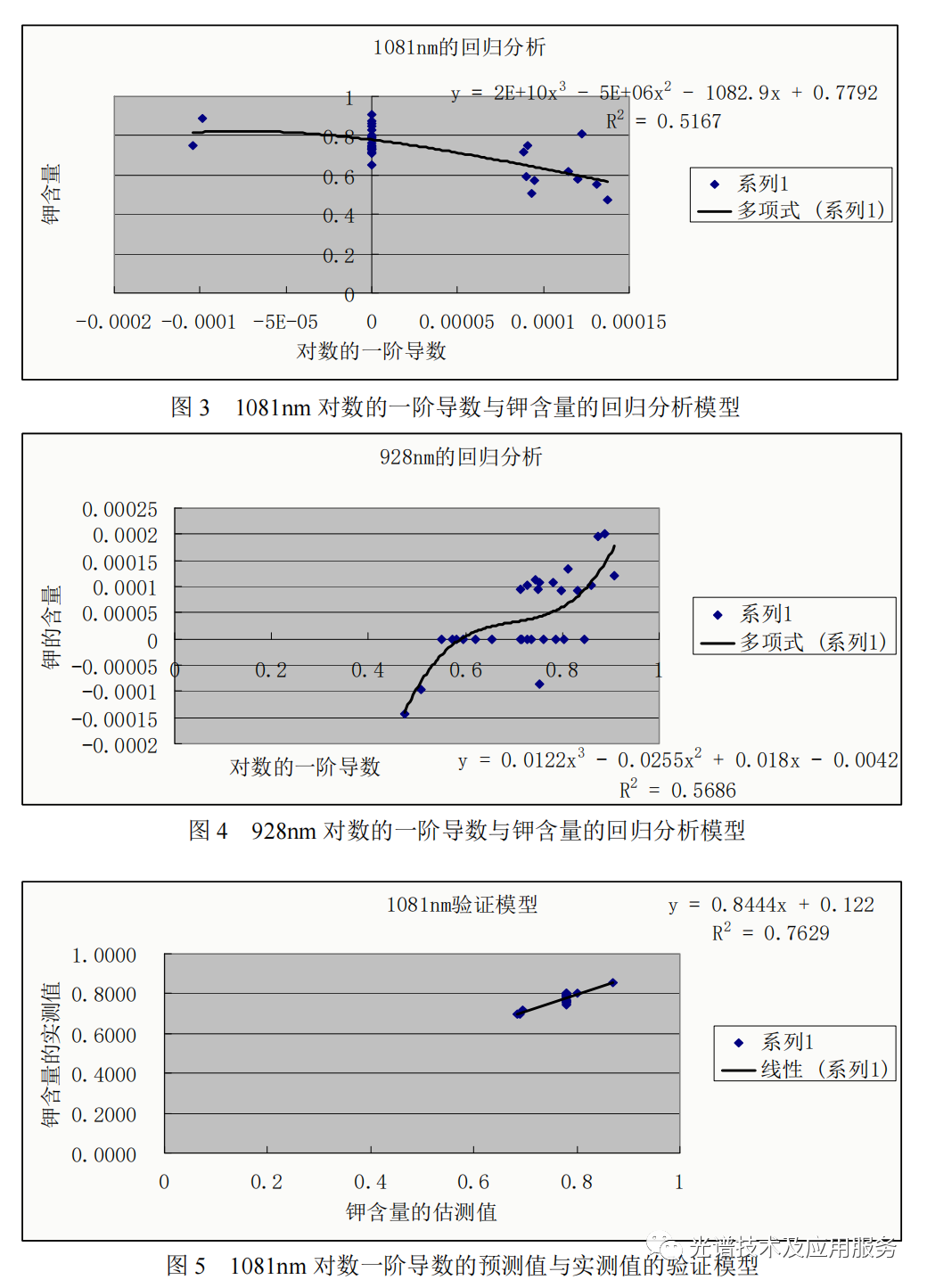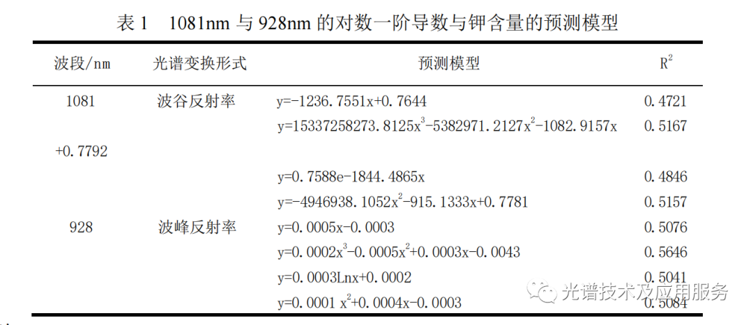 对苹果叶片钾素含量与相关性较强的光谱变换数据分别进行了逐步回归分析,获取了估测苹果叶片钾素含量的敏感波长。经过多次调试,最后得到光谱对数的一阶导数,光谱倒数的一阶导数,敏感波长分别为928nm、1081nm。然后以敏感波长构建的光谱参数为自变量,分别建立了钾素含量估测模型。