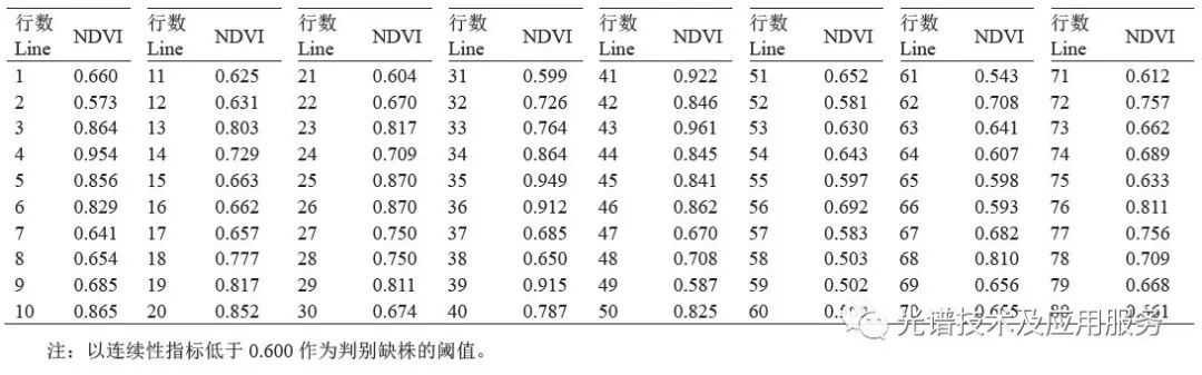 基于对葡萄行HSV图像的自动识别,可计算出各葡萄行中叶片所占面积与整行面积的比值,得到介于[0,1]之间的葡萄行连续性指标。对成龄葡萄园以连续性指标低于0.600作为判别缺株的阈值。在CS2008-1-1 地块的80行葡萄中,68行的连续性指标高于0.7,表明这些葡萄行内叶幕连续性良好;12行低于0.6,存在缺株;其他10行为长势一般(表4)。