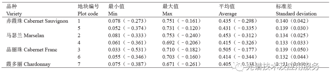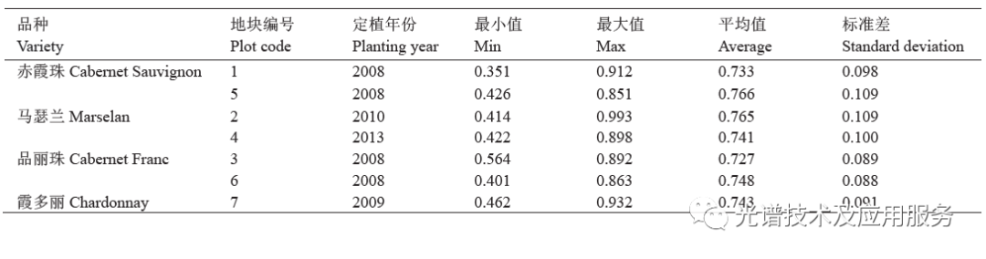 本研究中对同一葡萄品种的种植区采用了直线等分,比较地块间和不同行NDVI数据的最小值、最大值、平均值和标准误。在更精细的风土研究中,可以对NDVI平均值和标准误进行设置,通过自动化的数据运行,对地块进行非等面积和非直线划分,标出某一种植区或种植行内葡萄生长表现不同的地块或区段。由于风土的复杂性,除使用NDVI作为植被健康和生长的直接指标。