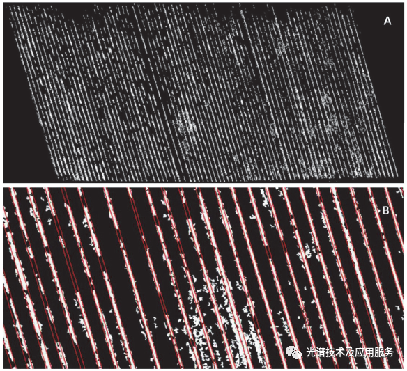 选取赤霞珠种植区CS2008-1-1,将图像色彩从RGB 转换到HSV空间,进而转换为二进制图像,其中白色像素点表示植被位置(图2,A)。通过机器识别,自动勾画出每行的叶幕宽度,标记出缺株的位置(图2,B)。