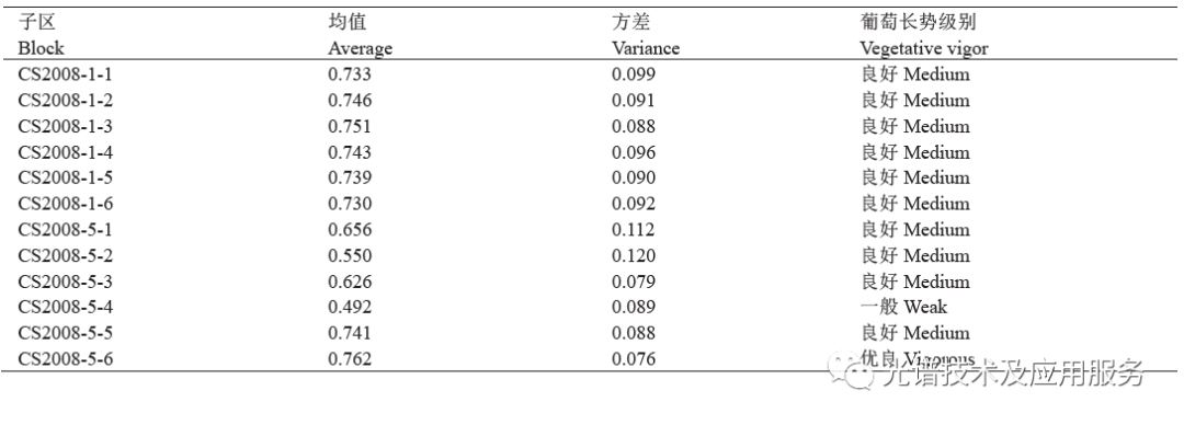 表3 赤霞珠种植区CS-2008-1和CS-2008-5内6个子区的NDVI和葡萄长势评估