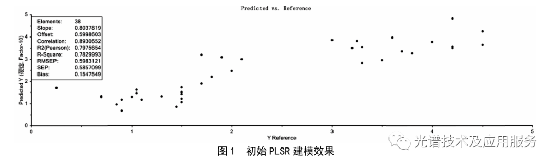 由图 1 可知,样品初始模型效果不佳,数据点不连续,R2值为 0.782。因此,需要对光谱进行处理后,达到降噪均匀优化光谱的目的,再进行 PLSR 预测模型。