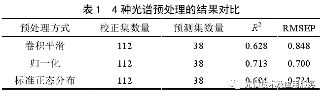 标准正态变换(Standard Normal Variate,SNV)是一种通过样品的方差对光谱进行校正的方法,SNV 可以有效的消除光源强度不一、散射噪声等检测时出现的干扰,通过线性变换对初始光谱数据标准化进行校正,减小样本因为表面散射、光谱迁移等因素带来的误差。经过上述预处理后模型结果如表 1 所示,归一化法拥有较小的 CV 值和较大的 R2值,表明其对结果的预测效果较好,因此后续的特征光谱提取均采用归一化法作为光谱的预处理方法。