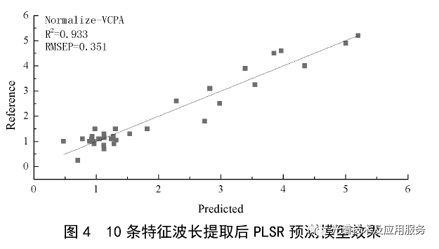 变量组合集群分析(VCPA)是一种新兴的特征变量识别算法,该方法的特点是充分考虑了变量集之间可能存在的影响。方法的计算原理是,首先通过利用二进制矩阵采样法对样本空间进行重采样,之后将数据随机划分为若干子集,针对子集分别建立子模型,最后对子模型一一进行评价。一般情况下,VCPA 算法计算过程如下:①先利用二进制矩阵采样法,对样本变量进行采样,选取目标函数 CV 值最小的变量子集;②计算每个波长点对应的化学值或者实测值,在本次迭代计算过程中出现的概率;③通过衰减函数筛选出概率较小的波长范围或者波长点,达到缩小变量集空间的目的;④最后将保留的变量重复上述过程将剩余变量进行组合,最终得到特征波长变量。使用 Matlab 运行 VCPA 程序多次后,选择 CV 值最小的波长组作为特征波长,共 10 条,将 10 条特征波长导入Unscrambler 后建模得到模型如图4所示,其 RMSEC 值为0.351,R2为 0.933。