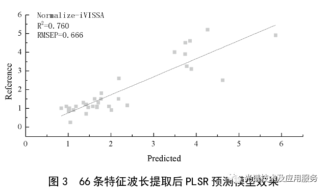 区间变量迭代空间收缩法(i VISSA)的主旨思想是选择最优区间,然后根据最优选区间再进行建模,该算法来自于VISSA 算法,之后结合全局和局部搜索,智能地优化波长的宽度、组合及间隔。在局部搜索上,i VISSA 算法使用光谱数据的连续性信息来确定波长间隔的宽度,在全局搜索上,主要搜索信息波长的组合和位置。最终用迭代的方式优化光谱间的数据间隔,确定光谱的组合、位置以及宽度。使用 Matlab 运行 i VISSA 程序多次后,选择 CV 值最小的波长组作为特征波长,一共 66 条,将 66 条特征波长导入Unscrambler 后建模得到模型如图3所示 , 其 RMSEC 值为0.666,R2为 0.760。
