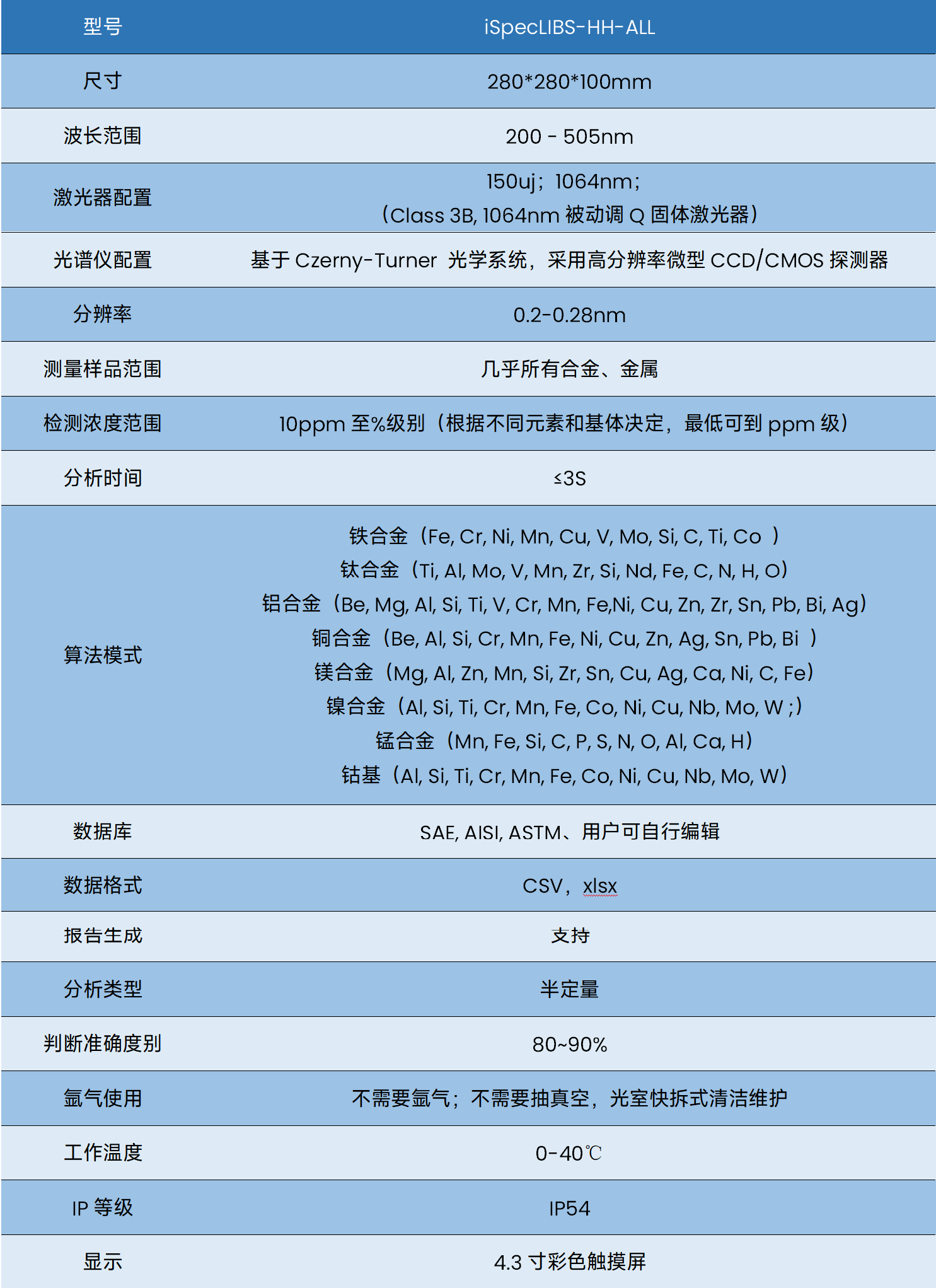 iSpecLIBS-HH-ALL手持式(合金)LIBS激光诱导光谱仪是便捷高效的金属分析利器。它运用激光诱导击穿光谱技术,聚焦样品产生等离子体,通过发射光谱实现元素分析。仪器仅 2.5kg,小巧轻便,IP54 等级确保在多尘、潮湿等复杂环境中稳定运行,便于携带至各类现场;一键操作,1 秒即出结果,简单高效。