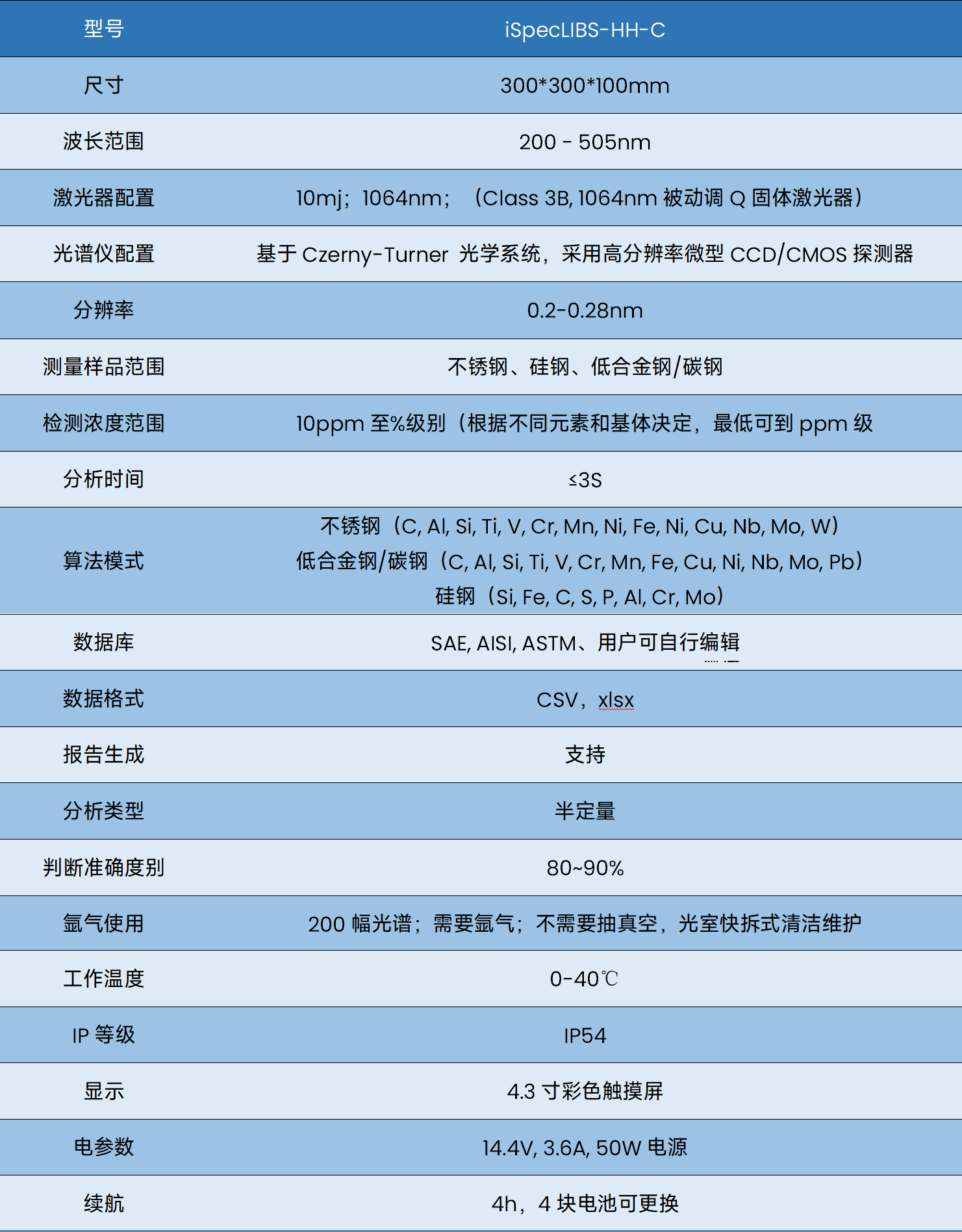 iSpecLIBS-HH-C手持式(碳钢)LIBS激光诱导击穿光谱仪是一款专为碳钢材料精准牌号识别与成分分析设计的便携式高端检测设备。它采用先进的激光诱导击穿光谱技术,通过高能量激光脉冲在样品表面产生等离子体,并分析其发射的特征光谱,从而实现对元素成分的定性和半定量分析。设备创新性地集成了高精度碳当量AI计算模型和氩气循环技术,单瓶氩气可支持约200次检测,大幅降低使用成本,提升检测经济性。