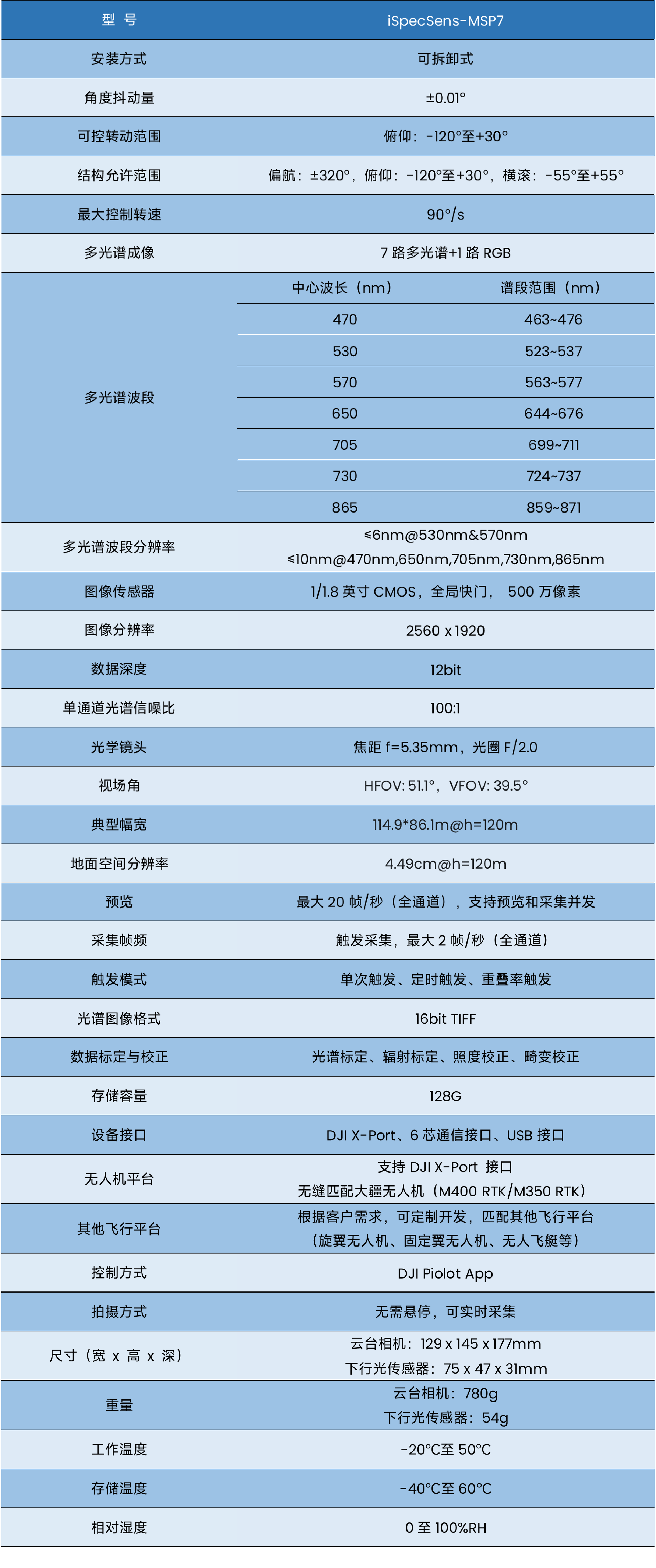 产品光谱范围覆盖400–1000nm,支持7 个光谱通道 + 1 个可见光通道并行采集,具备实时图传、实时解算、实时查看能力,可针对异常情况快速做出决策。