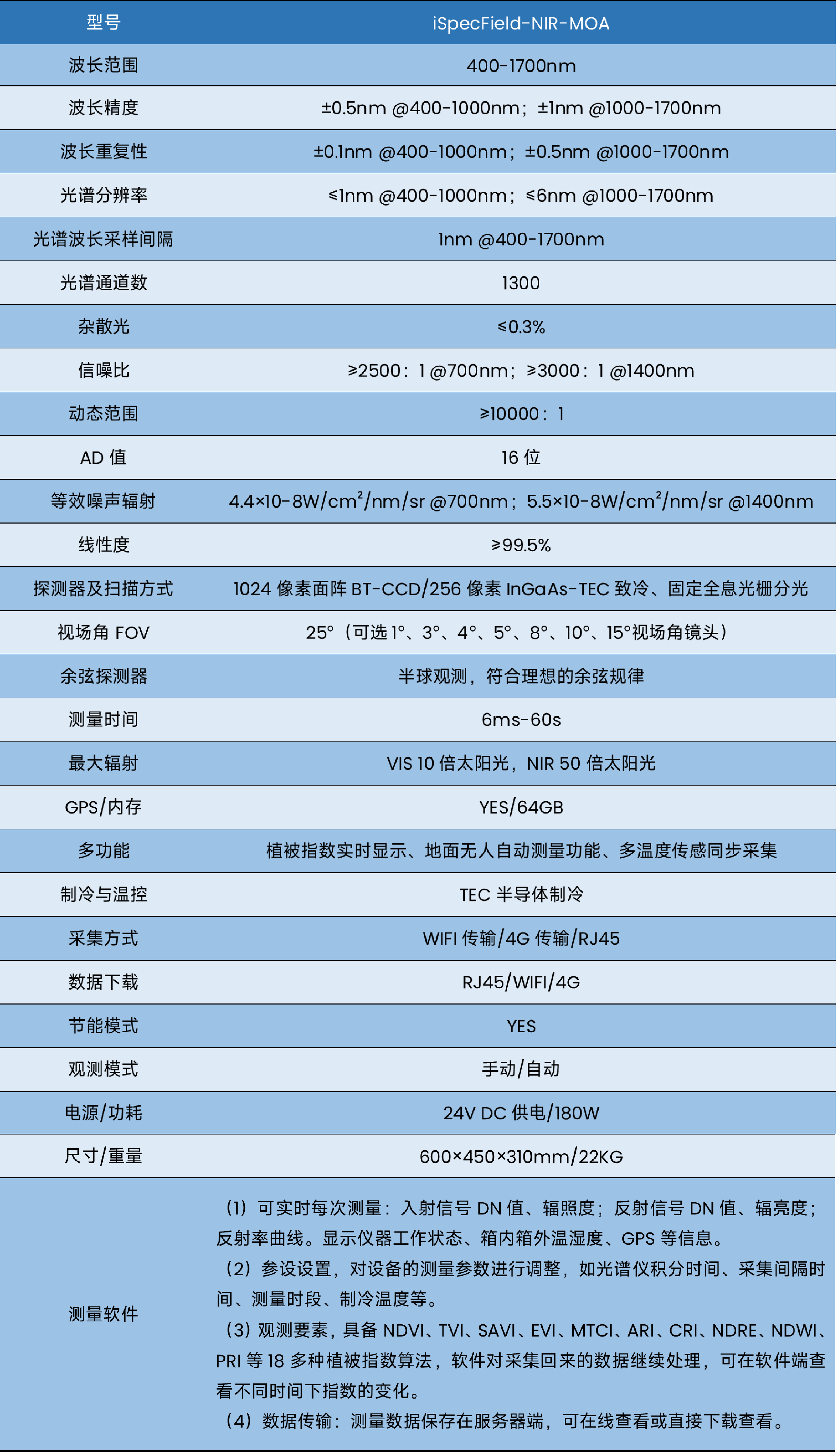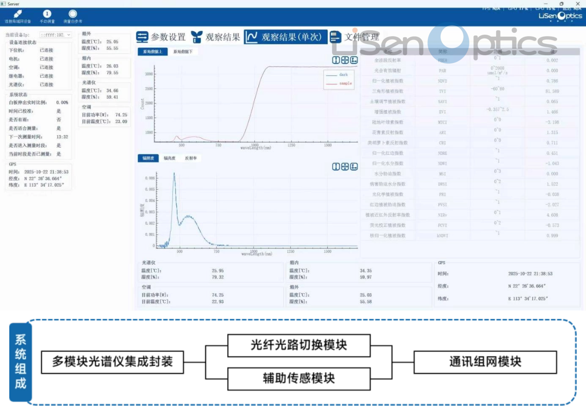 系统内置多种计算模型:可生成全波段反射率(FBRE)、光合有效辐射(PA)、归一化植被指数(NDVI)、三角形植被指数(TVI)、土壤调节植被指数(SAVI)、增强植被指数(EVI)、陆地叶绿素指数(MTCI)、类胡萝卜素反射指数(CRI)、归一化红边指数(DRE)、光化学植被指数(PRI)、植被近红外反射率指数(NIRv)、荧光校正植被指数(FCVI)等多种专业指标